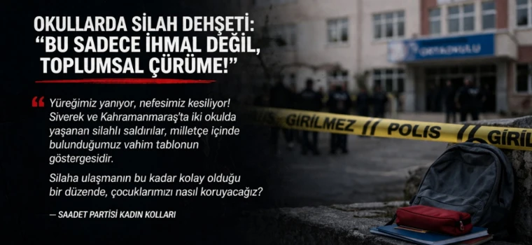 Saadet Partisi Kadın Kolları, yaşananların sadece güvenlik sorunu olarak değerlendirilemeyeceğini belirterek, “Bu tablo sadece bir güvenlik zafiyeti değildir. Bu tablo, bir toplumun iliklerine kadar hissettiği toplumsal bir cinnetin resmidir. Henüz 8. sınıfa giden bir çocuğun eline uzun namlulu silah alıp okul basabildiği bir düzende, hepimiz şapkamızı önümüze koyup düşünmek zorundayız” ifadelerine yer verdi.